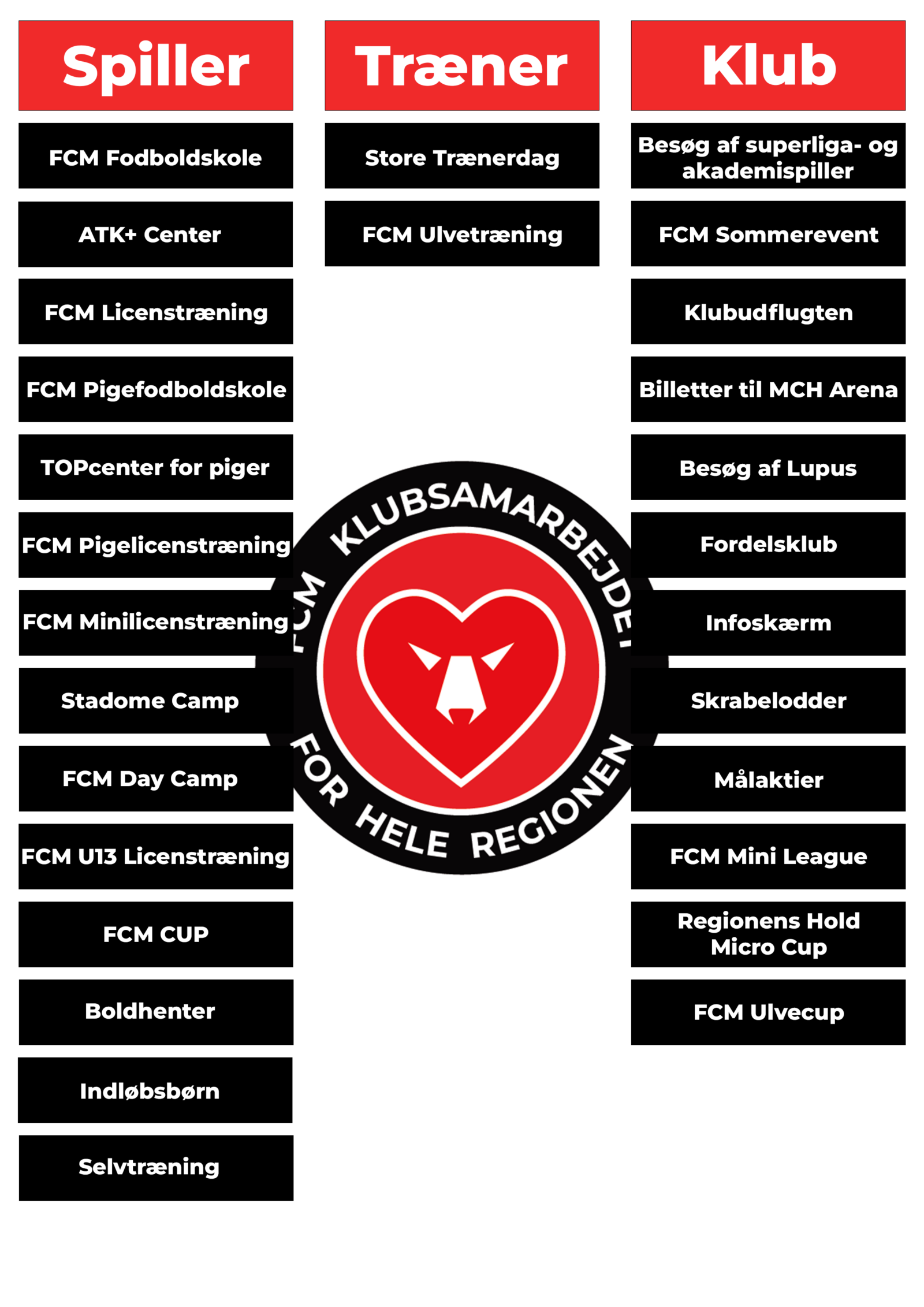 FCM Klubsamarbejdet har rigtig mange "varer på hylderne" rettet mod spillere - trænere - klub. Vi har samlet mulighederne i overskriftsform i en samlet oversigt. Gå tilbage til hjemmesidens forside og benyt menupunkterne til at finde mere info om de enkelte aktiviteter.