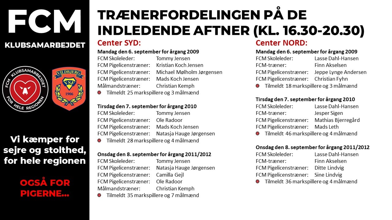 Vi har nu fået alle tilmeldingerne til FCM Pigefodboldskole ind. Listen med hvilke trænere, som deltager de enkelte aftener, kan ses herunder.