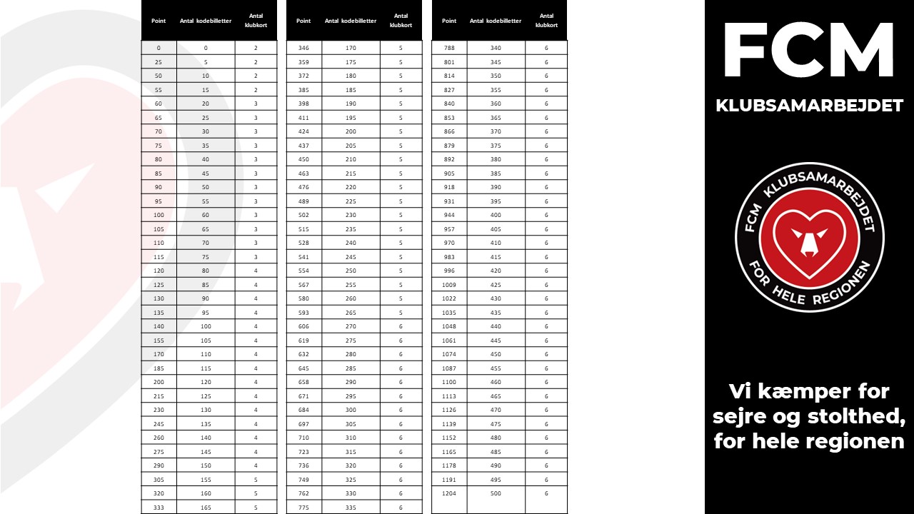Den kommercielle pointtabel som burde være kendt for I FCM Klubrepræsentanter gælder også i 2024. Her er det de point, som I har optjent i 2023, der danner basis for, hvor mange klubkort, kodebilletter og klubfordele i øvrigt I får tildelt i 2024.