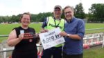 Vinderen af gavekortet til Falke Møbler flankeret af Peter Kirchhecker, Tarm IF og Claus Steinlein, CEO, FCM.