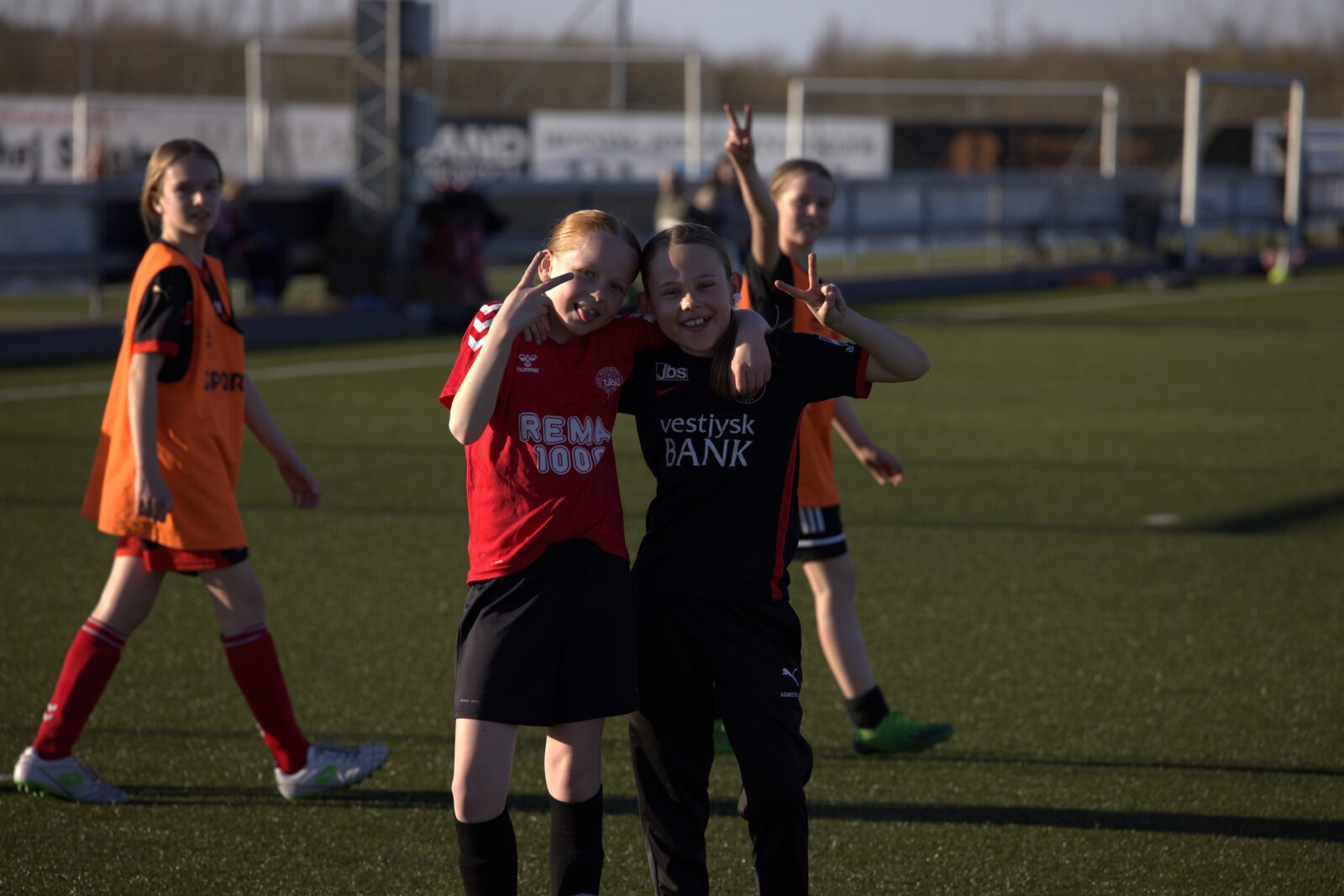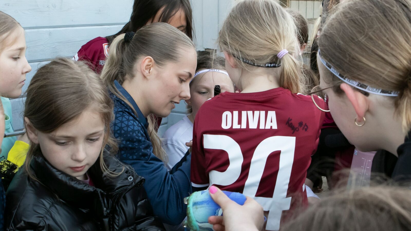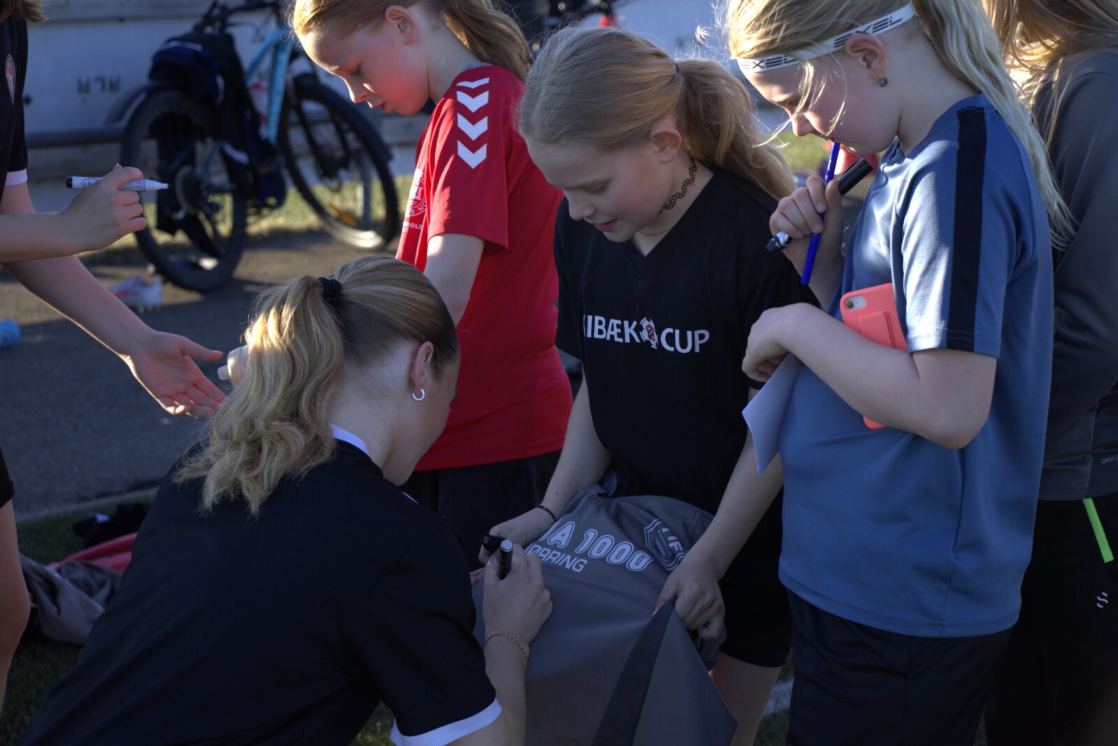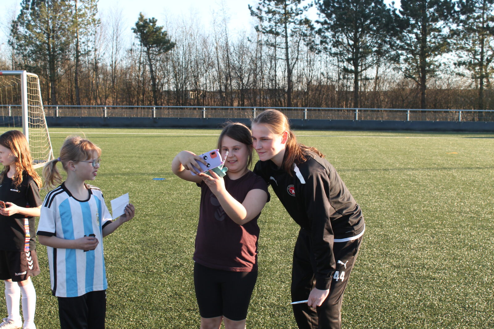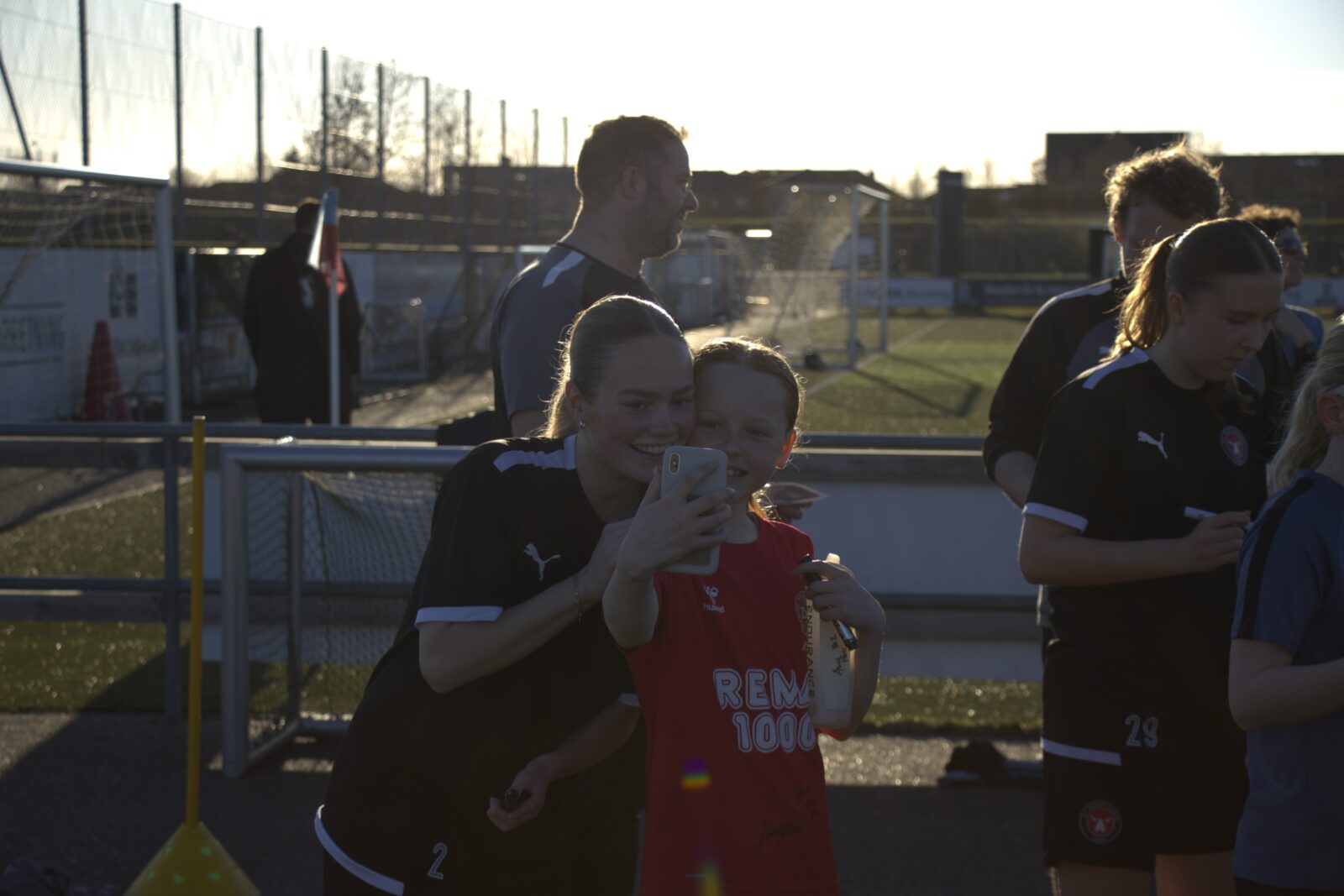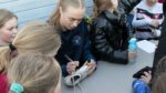 ”Det var dejligt for fodboldpigerne i Snejbjerg at komme på græs, og endnu bedre blev det fordi vi havde besøg af 3 skønne FCM-spillere, nemlig Fie Nordmark, Mathilde Kalhøj og Lærke Mølholm. Efter træningen skrev FCM-spillerne autografer på støvler, t-shirts, bolde osv., og der blev taget massevis af fotos med Snejbjerg-spillerne. Tusind tusind tak til Fie, Mathilde og Lærke for et dejligt besøg, kampbilletter og kæmpe tålmodighed”.